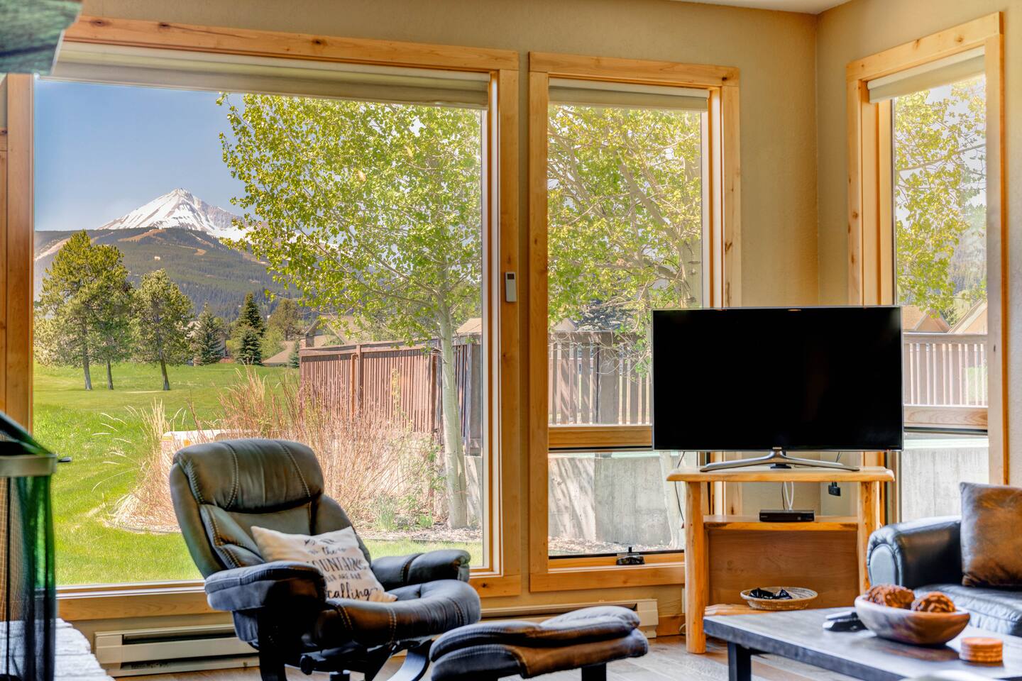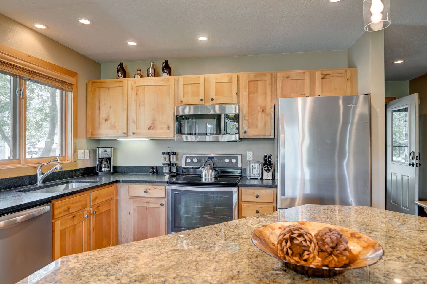 The living room is flooded with natural light, thanks to the large windows and light décor. Cozy up on the sofa and warm your toes by the fireplace while watching a show on the smart TV. This modern mountain retreat is the perfect place for your group to relax after exploring the stunning outdoors.