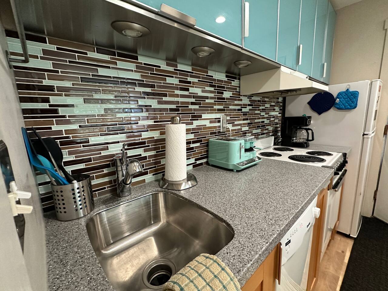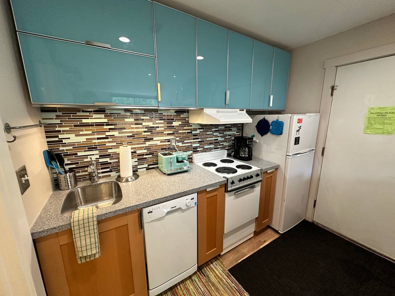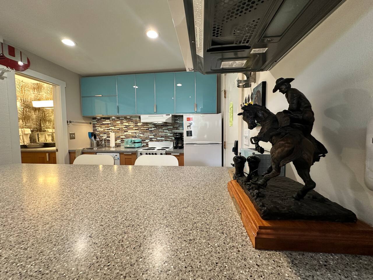 The open concept kitchen is the perfect place to make delicious meals. You’ll find all necessary appliances, cookware and dishware, essential spices, and plenty of space to prepare your meals. Take a seat on the kitchen counter chairs and enjoy your morning coffee or share meals with your group.