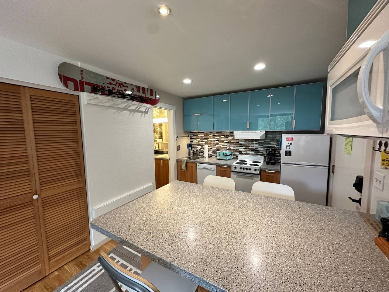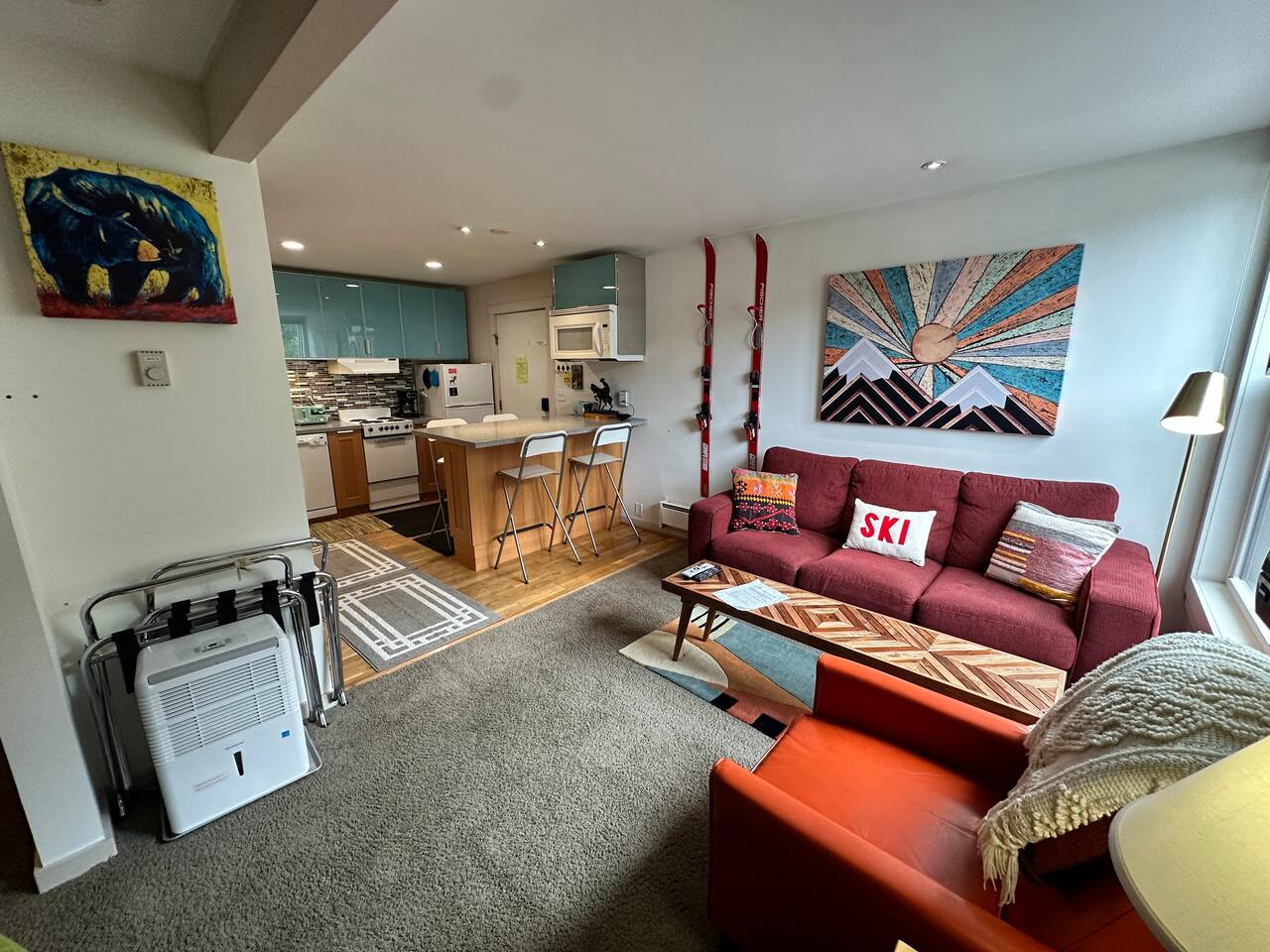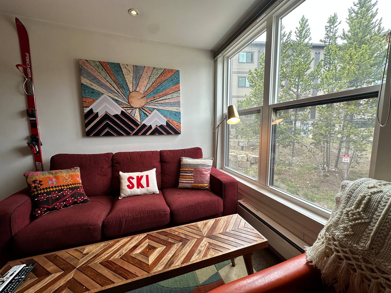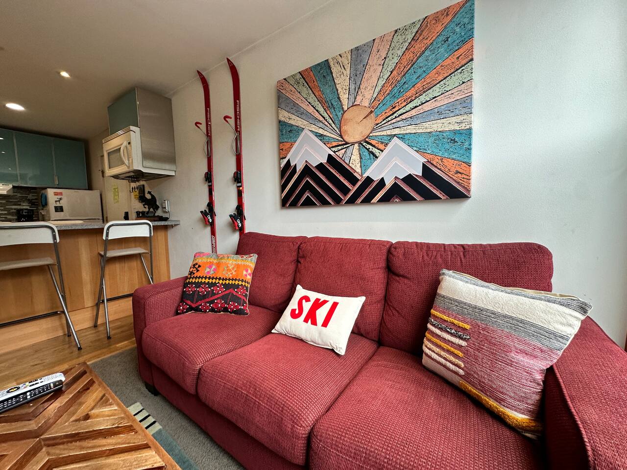 The living room is retro themed, thanks to the classic ski décor. Cozy up on the sofa while watching TV. This modern mountain retreat is the perfect place for your group to relax after exploring the stunning outdoors.