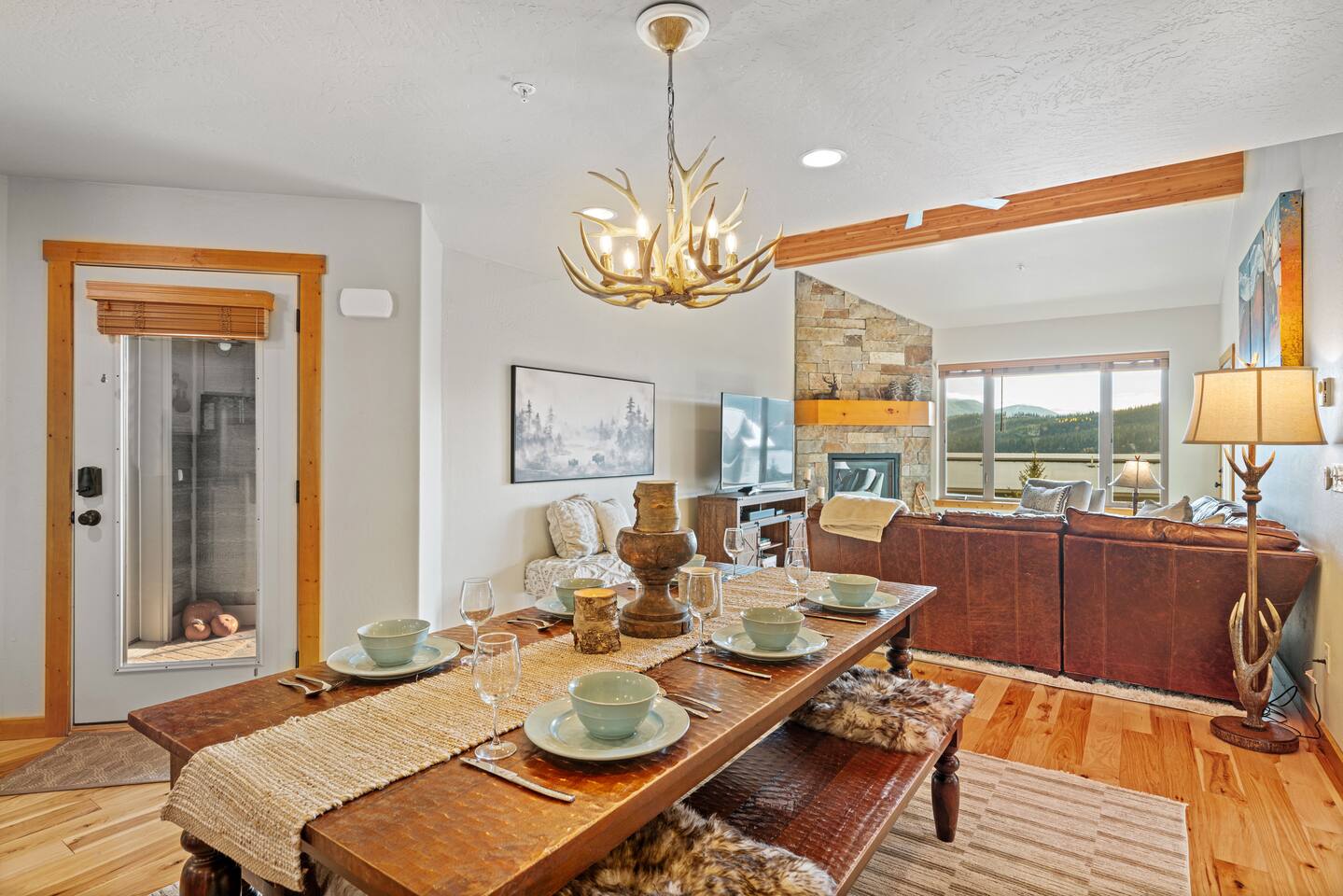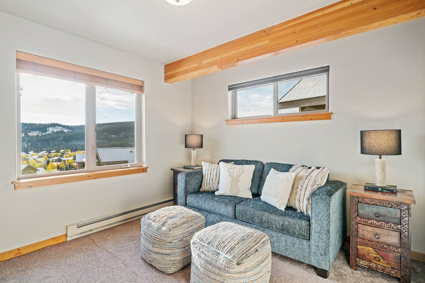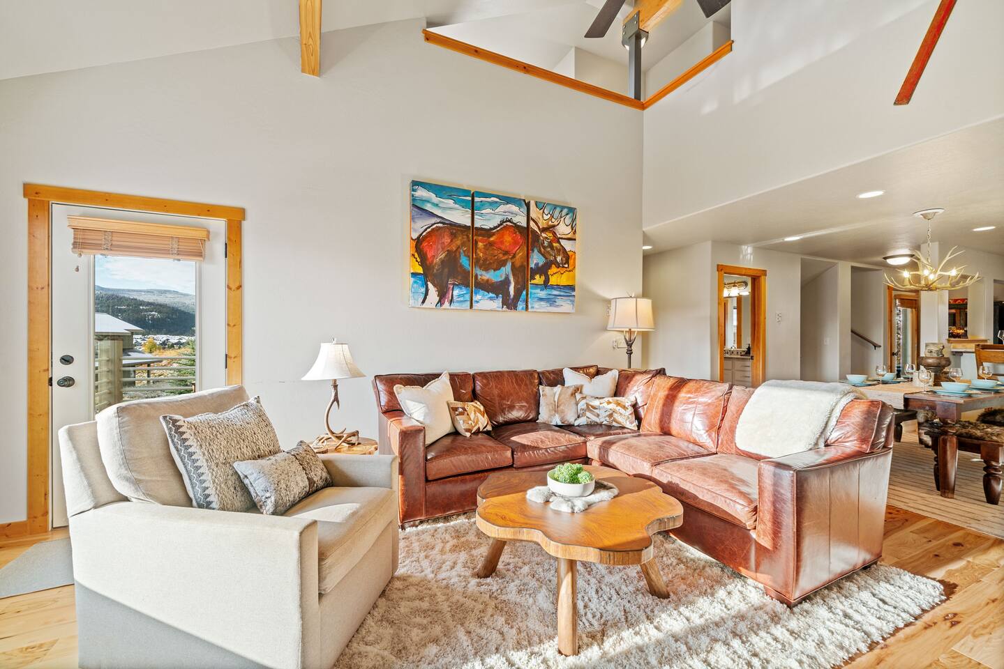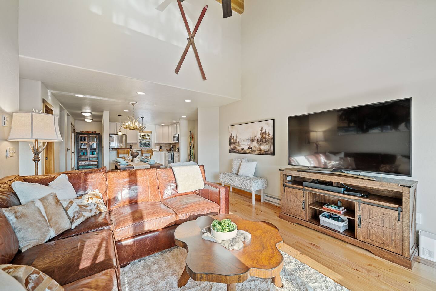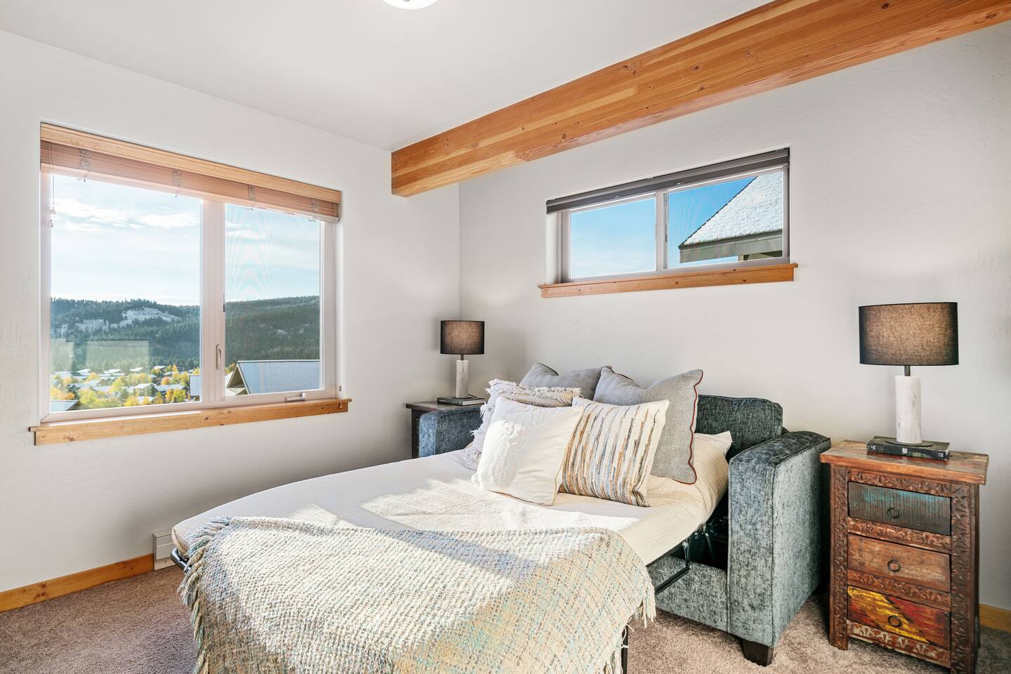 ✔ Large windows, high ceilings + charming cabin décor