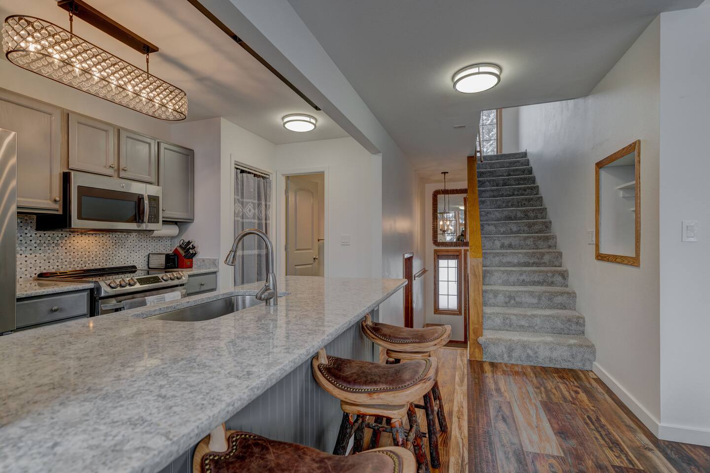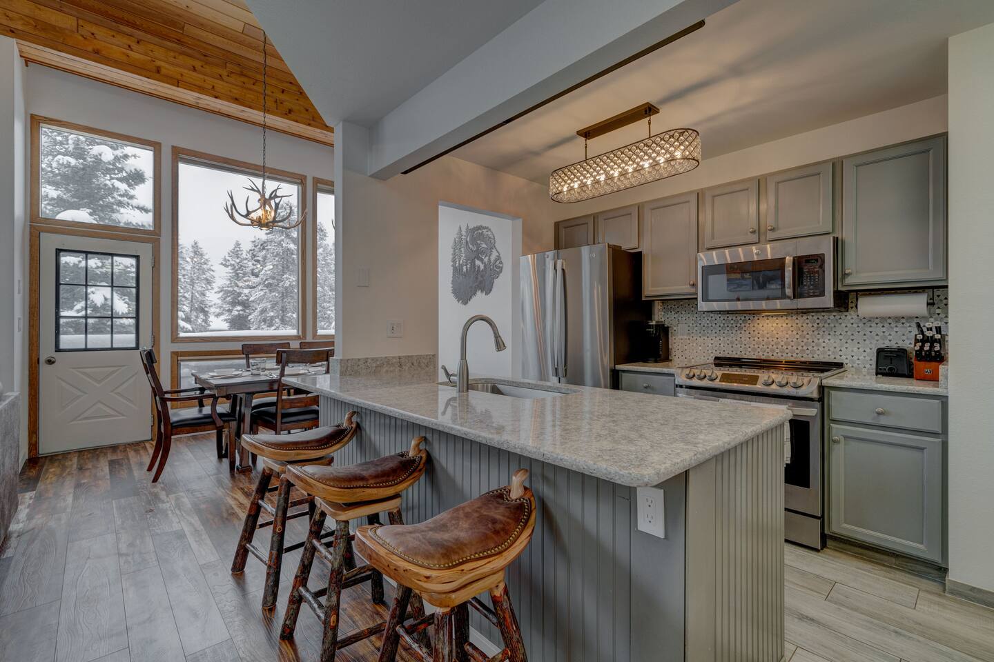 The open concept kitchen is the perfect place to make delicious meals for the whole family. You’ll find high end appliances, cookware and dishware, essential spices, and plenty of space to prepare your meals. Take a seat on the kitchen counter saddle chairs and enjoy your morning coffee or share meals with your family around the dining table.