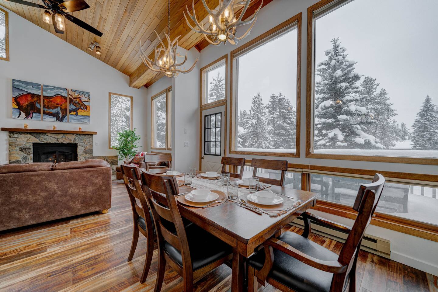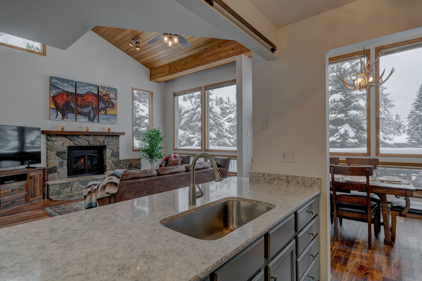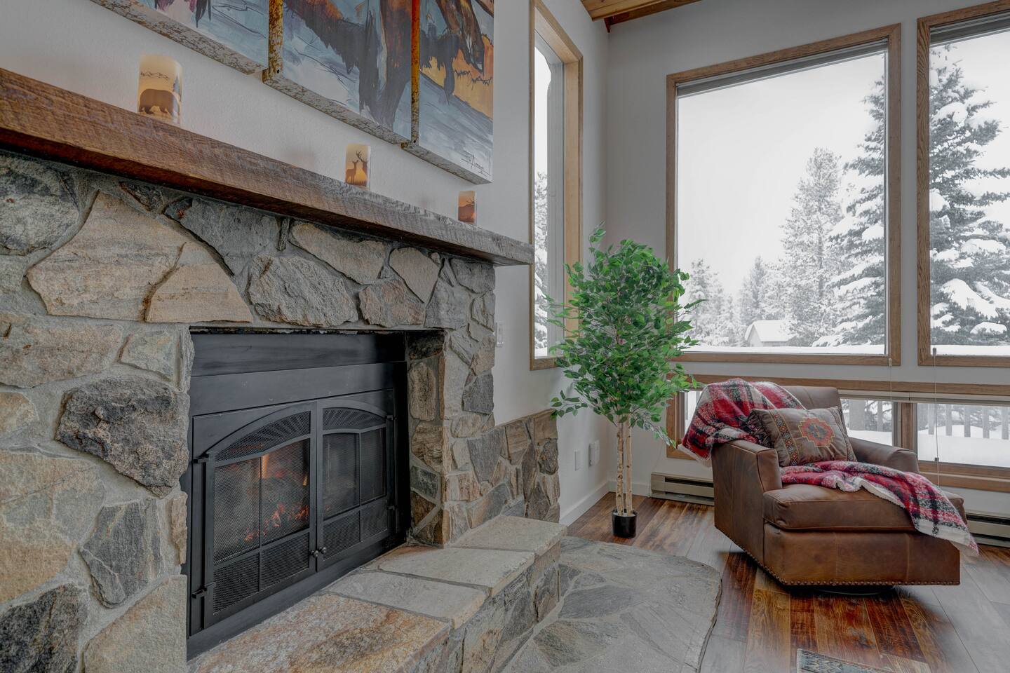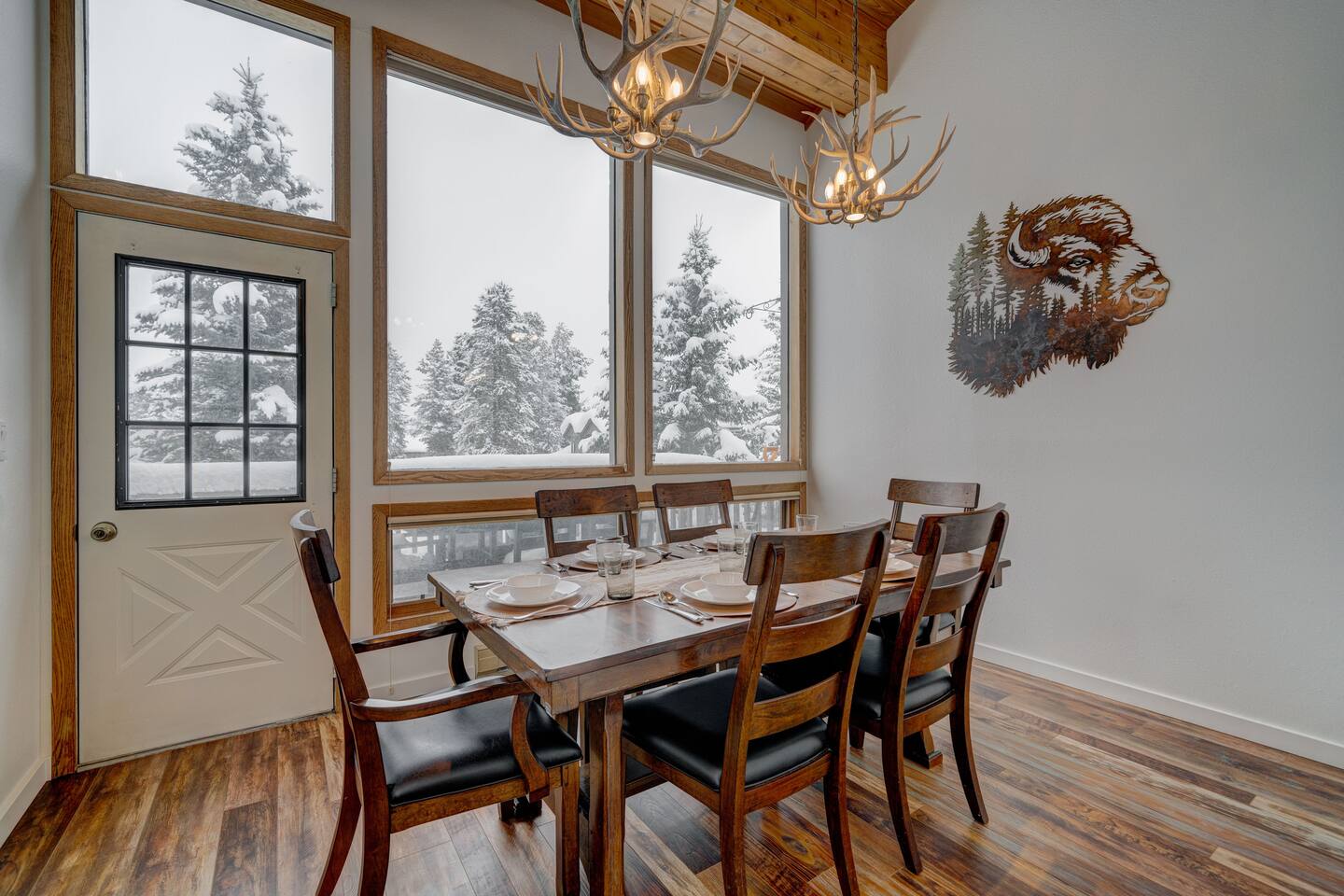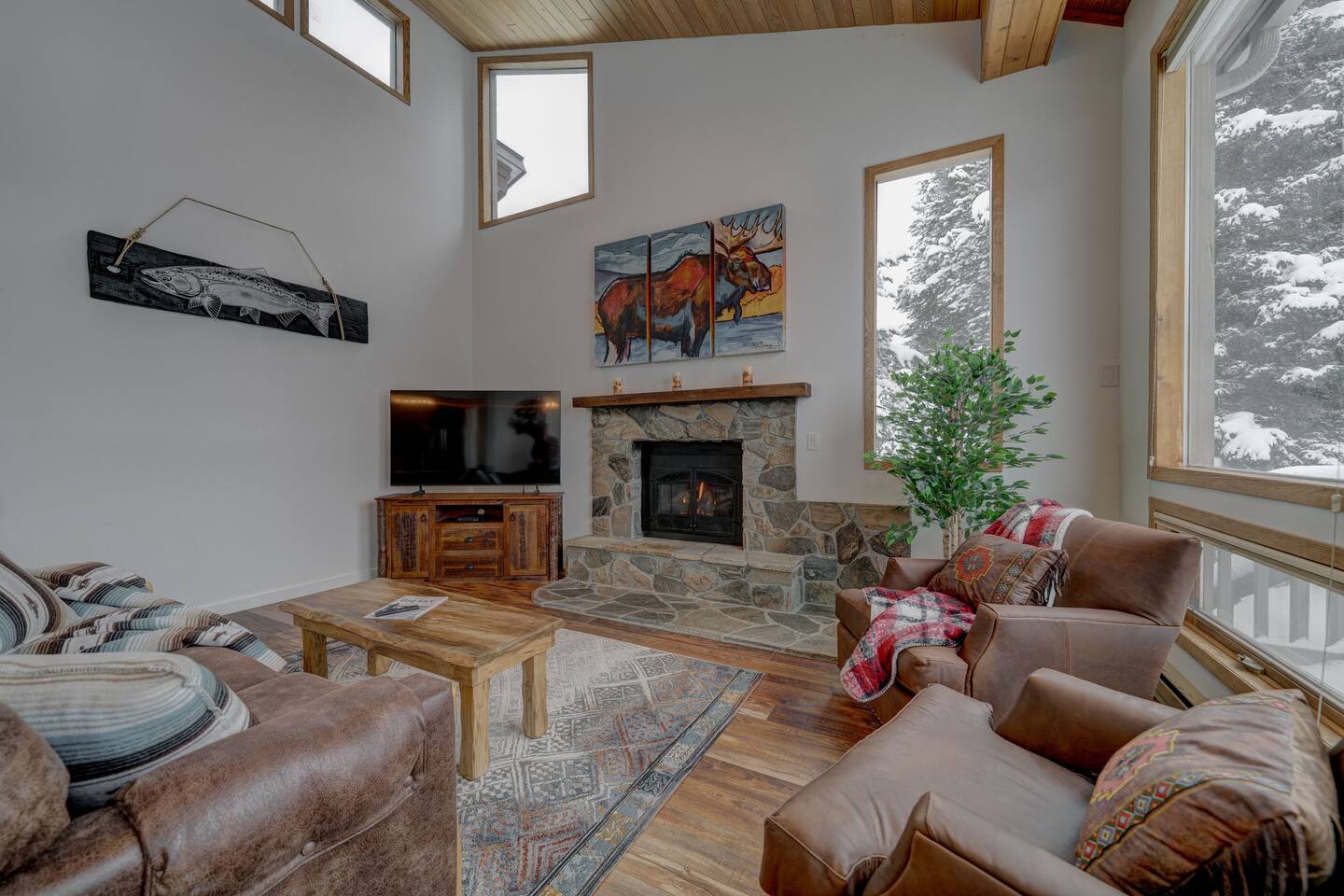 The living room is flooded with natural light, thanks to the large windows and light décor. Cozy up on the sofa and warm your toes by the fireplace while watching a show on the smart TV. This modern mountain retreat is the perfect place for your group to relax after exploring the stunning outdoors.