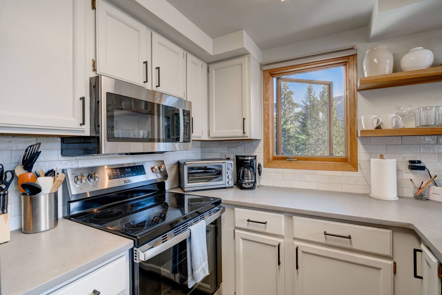 The updated, fully equipped kitchen features modern appliances and essential spices, making it a joy to prepare meals for your group. Enjoy your creations at the dining table while soaking in the spectacular mountain views.