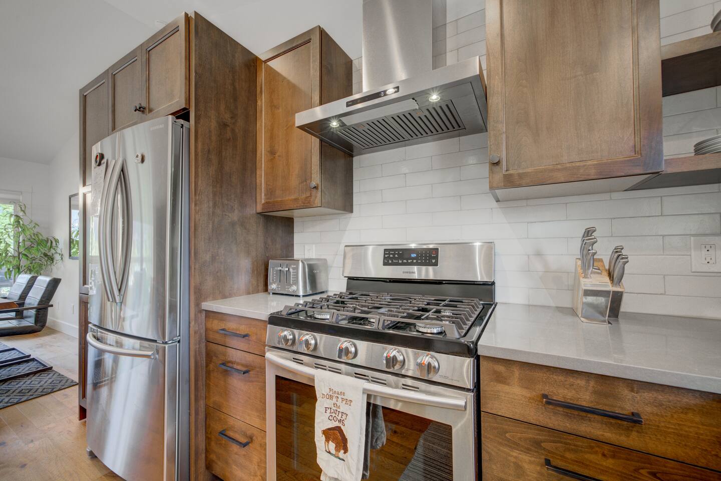 The open concept kitchen is the perfect place to make delicious meals for the whole family. You’ll find high end appliances, cookware and dishware, essential spices, and plenty of space to prepare your meals. Take a seat at the kitchen counter and enjoy your morning coffee or share meals with your family around the dining table.